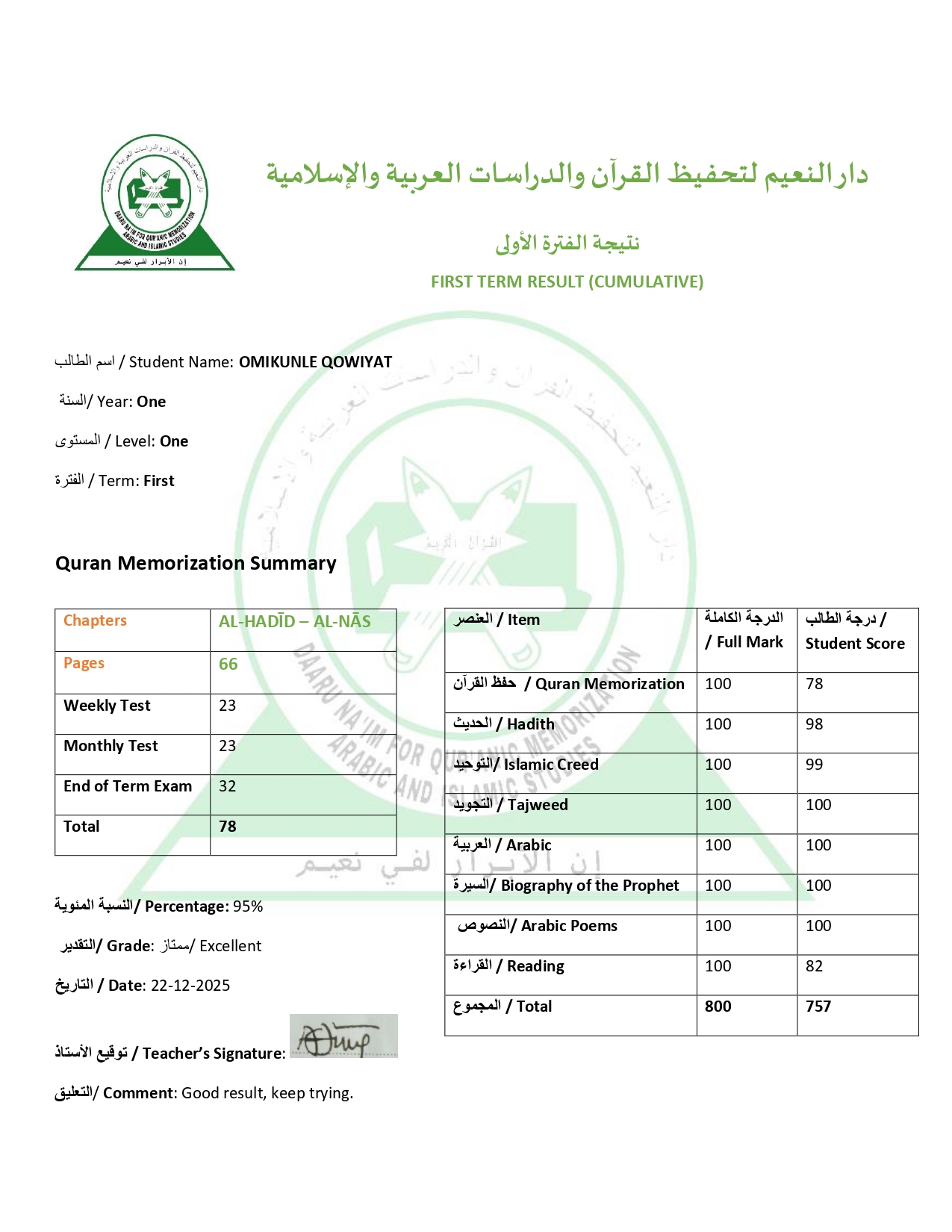 Daaru-Naʿīm for Qur’anic Memorization, Arabic and Islamic Studies